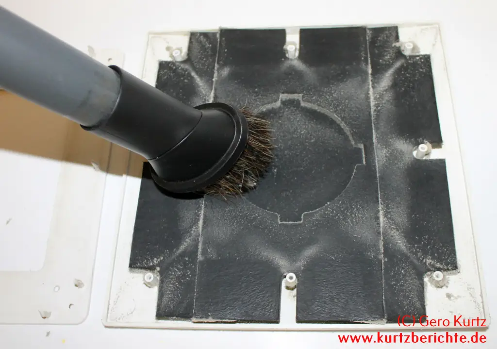 - Dann greifen wir uns vorsichtig den Filter. Haben Sie einen neuen, dann gleich wegwerfen, ansonsten auf den Boden legen und mit dem Staubsauger und einem auf das Staubsaugerrohr aufgesetzten Staubpinsel* gründlich absaugen. Sie können ihn auch bei 30 Grad per Handwäsche mit etwas Handwaschmittel säubern und zum Trocknen aufhängen.