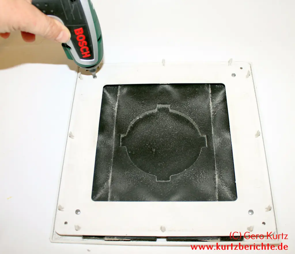 - Wenn das erledigt ist, den Rahmen am besten gleich wieder aufschrauben. Dabei darauf achten, dass die Haltenasen nach außen zeigen!